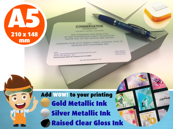 With a glint of metallic gold edge to these round cornered cards, these invitations are sure to impress! Perfect for your formal events and very special occasions, this is an invitation that doesn’t get forgotten. Printed one side or both sides on white round cornered gold gilt edged uncoated matt 330gsm card. Choose from full colour printing or lower cost black and white only printing. White gummed 120gsm greeting card style envelopes available.